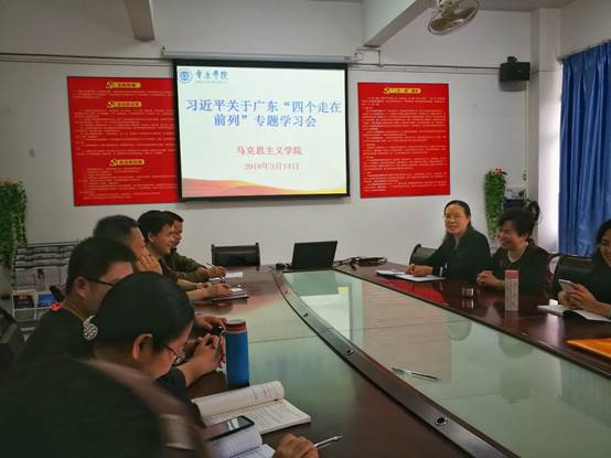 314日,公司党总支理论中心组学习扩大会议在院会议室举行,会议由曹顺霞书记主持。党员认真学习了习近平在37日参加十三届全国人大一次会议广东省代表团讨论时发表的重要讲话精神。党的十八大召开以来,习近平非常关注广东的发展,从2012年对广东提出三个定位,两个率先2017年提出“四个坚持、三个支撑,两个走在前列到这次对广东提出四个走在全国前列,反映了中央对我省的期望。党员老师表示一定要认真学习习总书记讲话精神,贯彻到自己的教学教研工作中,努力为把我省建设成为向世界展示践行习近平新时代中国特色社会主义思想、展示我国改革开放成就、国际社会观察我国改革开放的重要窗口示范区做出应有贡献。