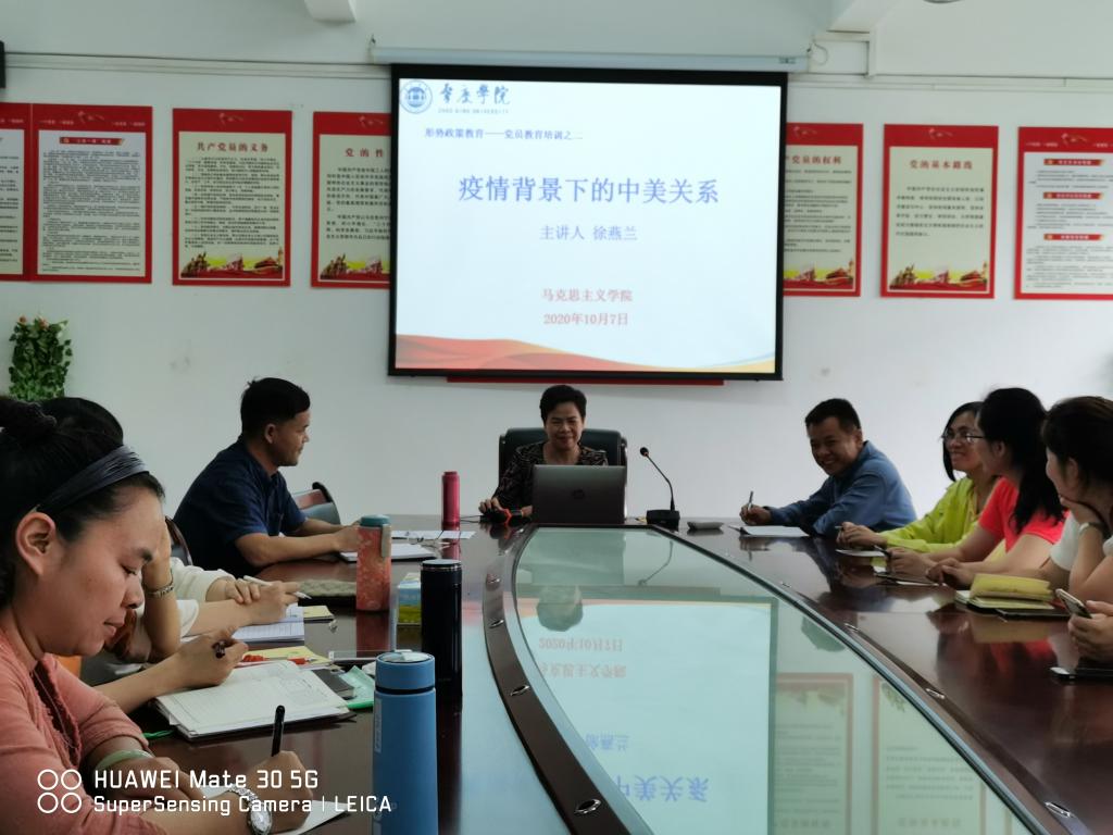 为了进一步加强公司全体党员教师的党员教育,10月7日下午,公司徐燕兰教授为公司全体教师作了题为《疫情背景下的中美关系》的党员形势与政策教育培训。