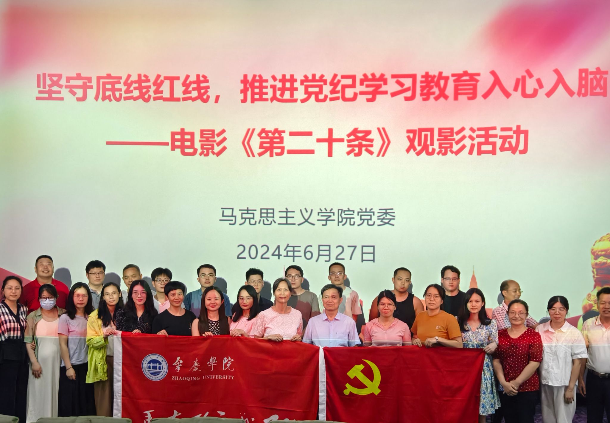 本网讯 6月27日晚,公司党委组织全体党员教职工开展集中观看电影《第二十条》主题党日活动,进行法治教育,加强党性修养,加深全体教职工党员对正在进行的党纪学习教育的深刻认识和理解。