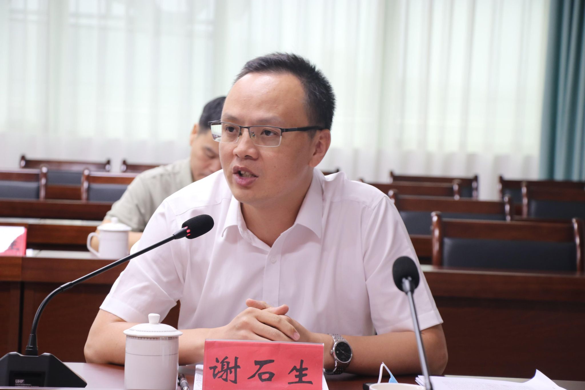 曹和修现场被与会人员推选为专家组组长,并主持座谈环节的会议。在座谈会上,曹和修作了题为“加快建设高质量教育体系 推进大中小学思政课一体化改革创新”的发言,谢石生作了题为“进一步全面深化改革的科学指南和行动纲领”的发言。两位老师的发言获得了与会领导、专家的充分肯定和高度认可。