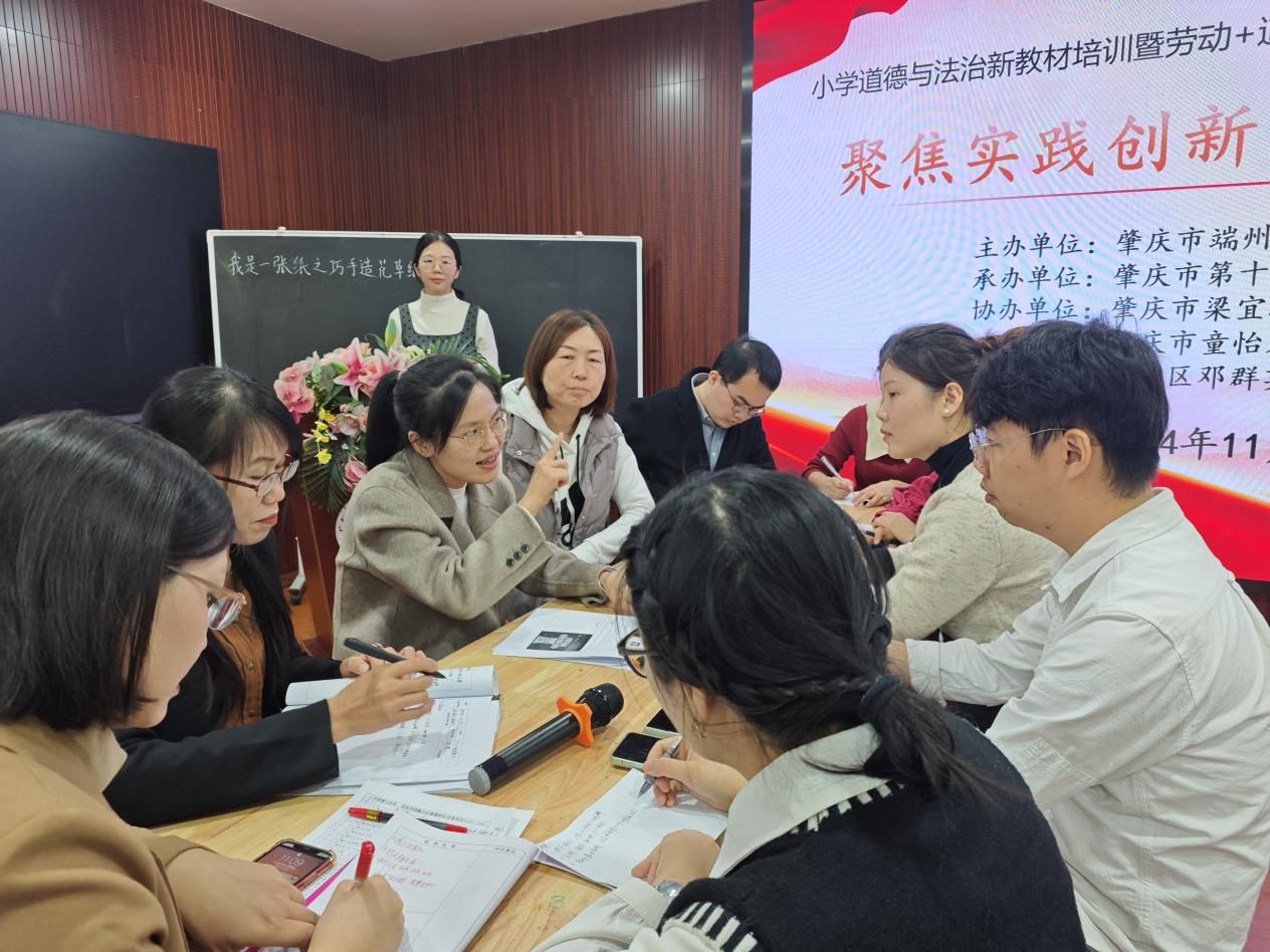 活动现场,肇庆市第十六小学何海珠老师以《人人爱护公物》为题,设置主题播报、小组闯关、示范操作等形式,引导员工爱护公物,热爱公司,展开为生活化、活动化、主体化的小学思政课。肇庆市第十六小学彭梅、唐俊杰以《我是一张纸之巧手造花草纸》为题,彭老师通过视频导入引导员工关注生活用纸,通过视频讲述古代四大发明之“造纸术”,鼓励员工讲述造纸的流程与步骤,从道法课向劳动课融入;唐老师充分利用智能技术,引入花草纸的工艺料包,组织同学分工协作,完成小组作品“花草纸”的制作,最后课堂教学主旨升华,引领员工体会绿水青山就是金山银山的重要发展理念。