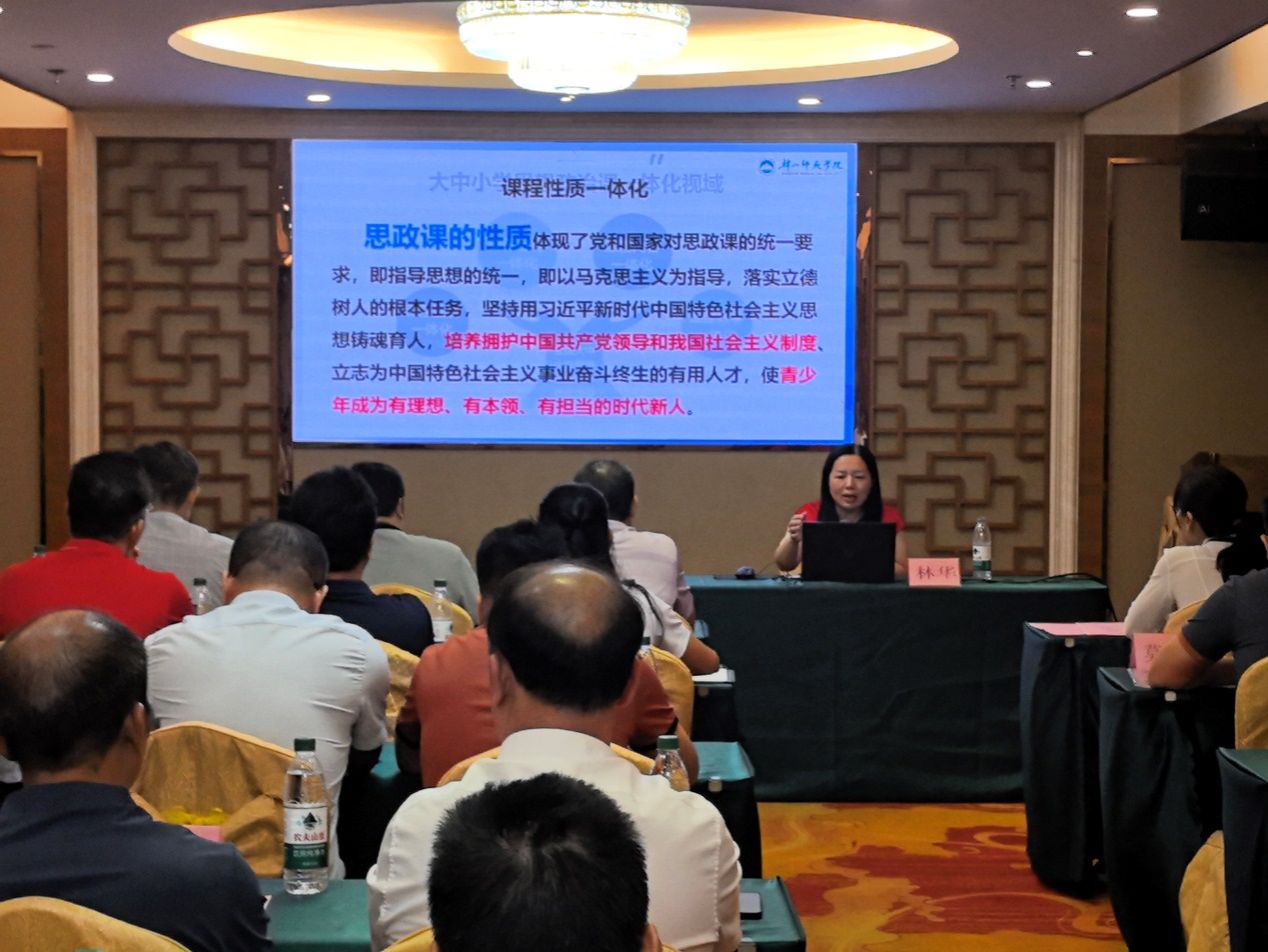 随后,来自韩山师范公司的教授、硕士生导师林华为与会老师带来了名为《大中小学思政一体化协同育人视域下的中学政治教材分析与思想政治课新教学》的专题辅导。与会老师代表廷锴纪中德育处黄诠华主任和罗定泷州小学梁晓镠副董事长也结合自身公司的实际,分享了他们思政教学中的特色做法和实践经验。