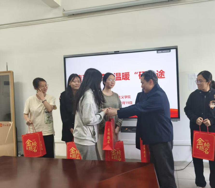 现场师生亲切交流,氛围温馨,公司领导们的细心叮嘱和祝福,给予了员工们坚定前行的动力源泉。随后,公司领导们一同为同学们发放为考研学子们精心准备的“考研暖心礼包”,点滴物资凝聚着公司对同学们日常学习生活的深切关怀。
