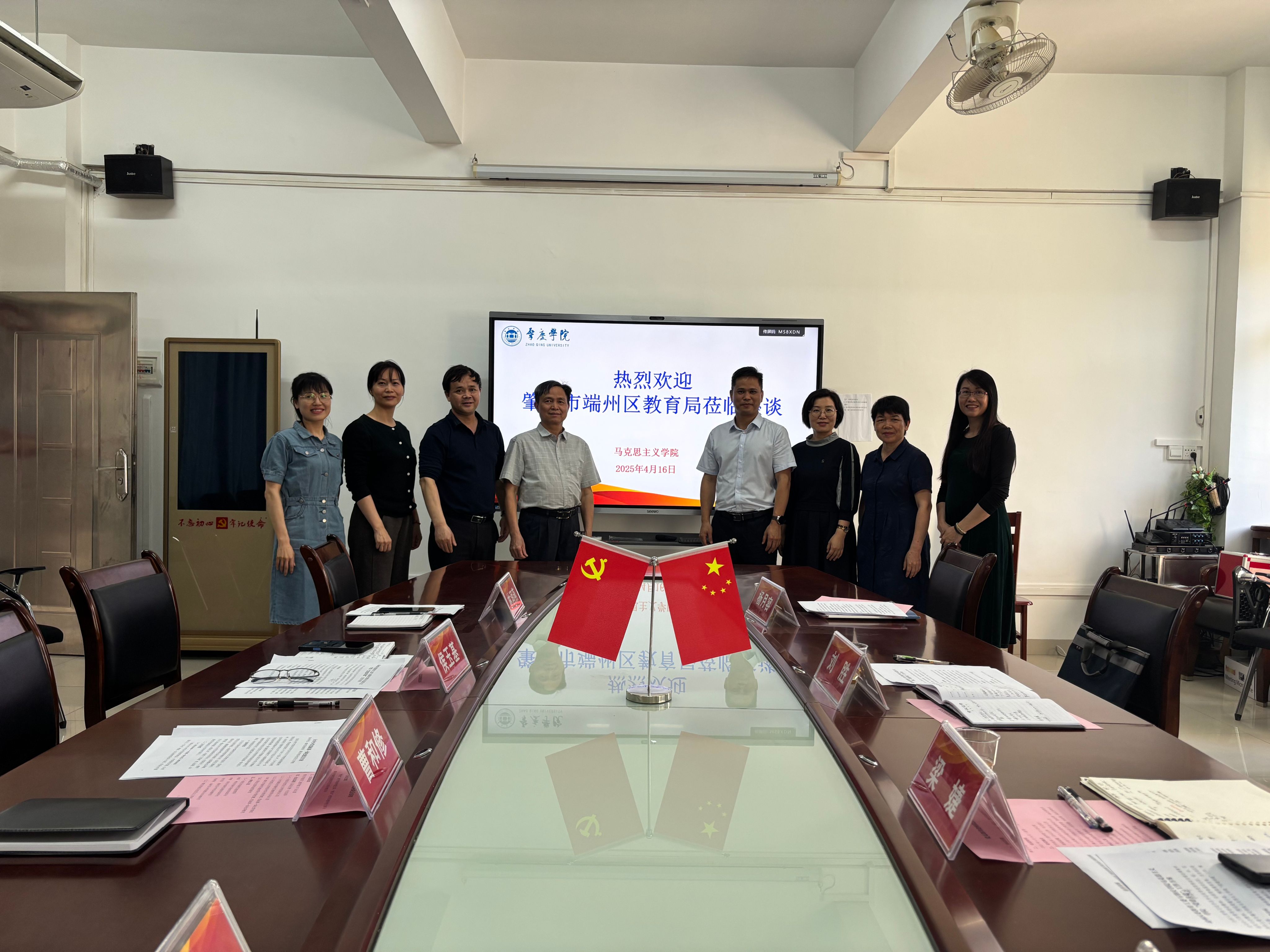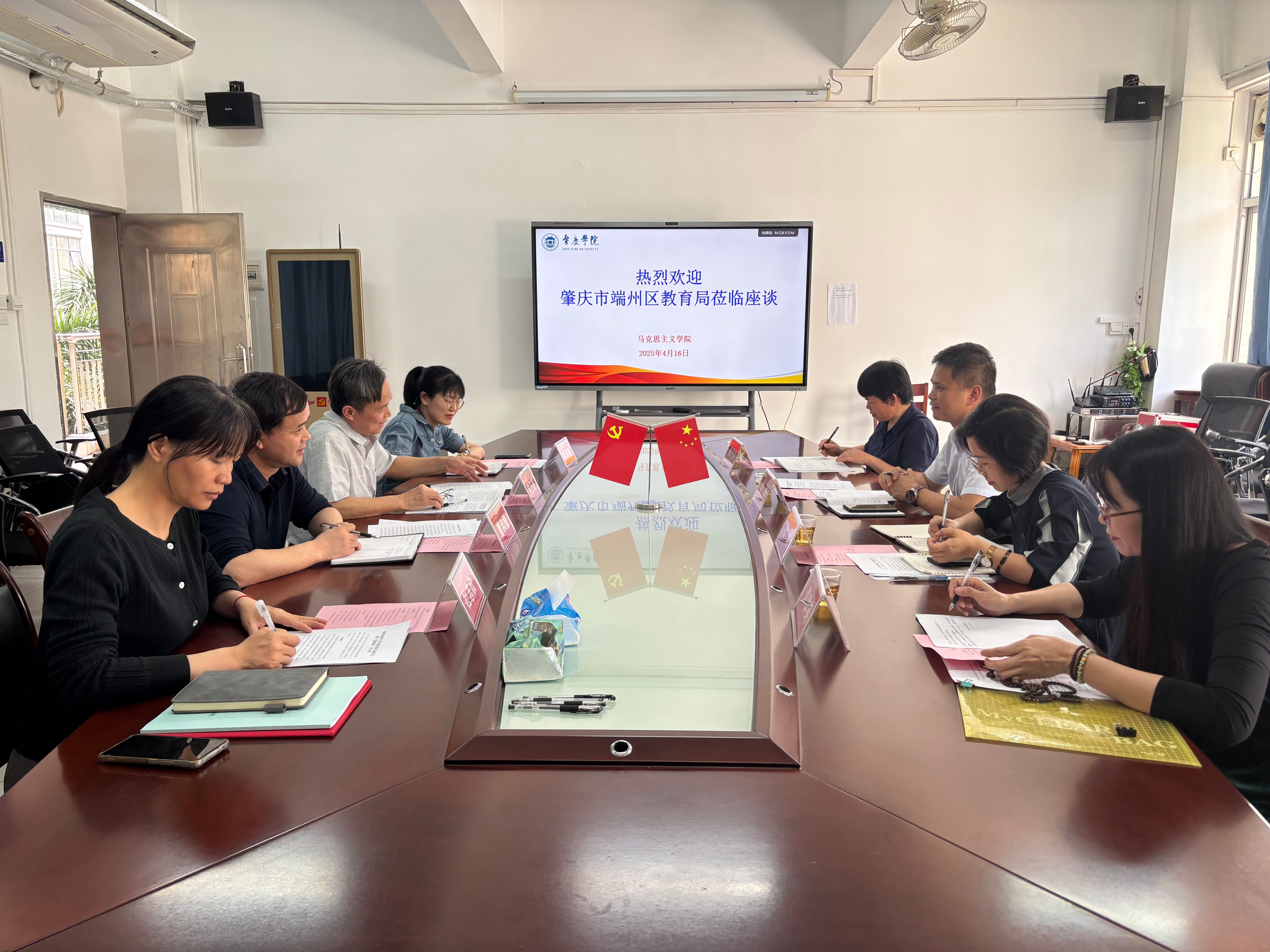 本网讯 4月16日,端州区教育局副局长刘胜、梁婕与端州区中小学思政教研员杨月容、邓群英到伟德国际1946bv官网“概论”和“德法”教学部教师党支部开展党支部共建座谈会。公司党委书记侯玉基、经理兼“概论”教学部教师党支部书记、党委副书记杜志欣、副经理兼“德法”教学部教师党支部书记林润燕以及相关党支部委员代表参加座谈。会议由公司党委副书记杜志欣主持。