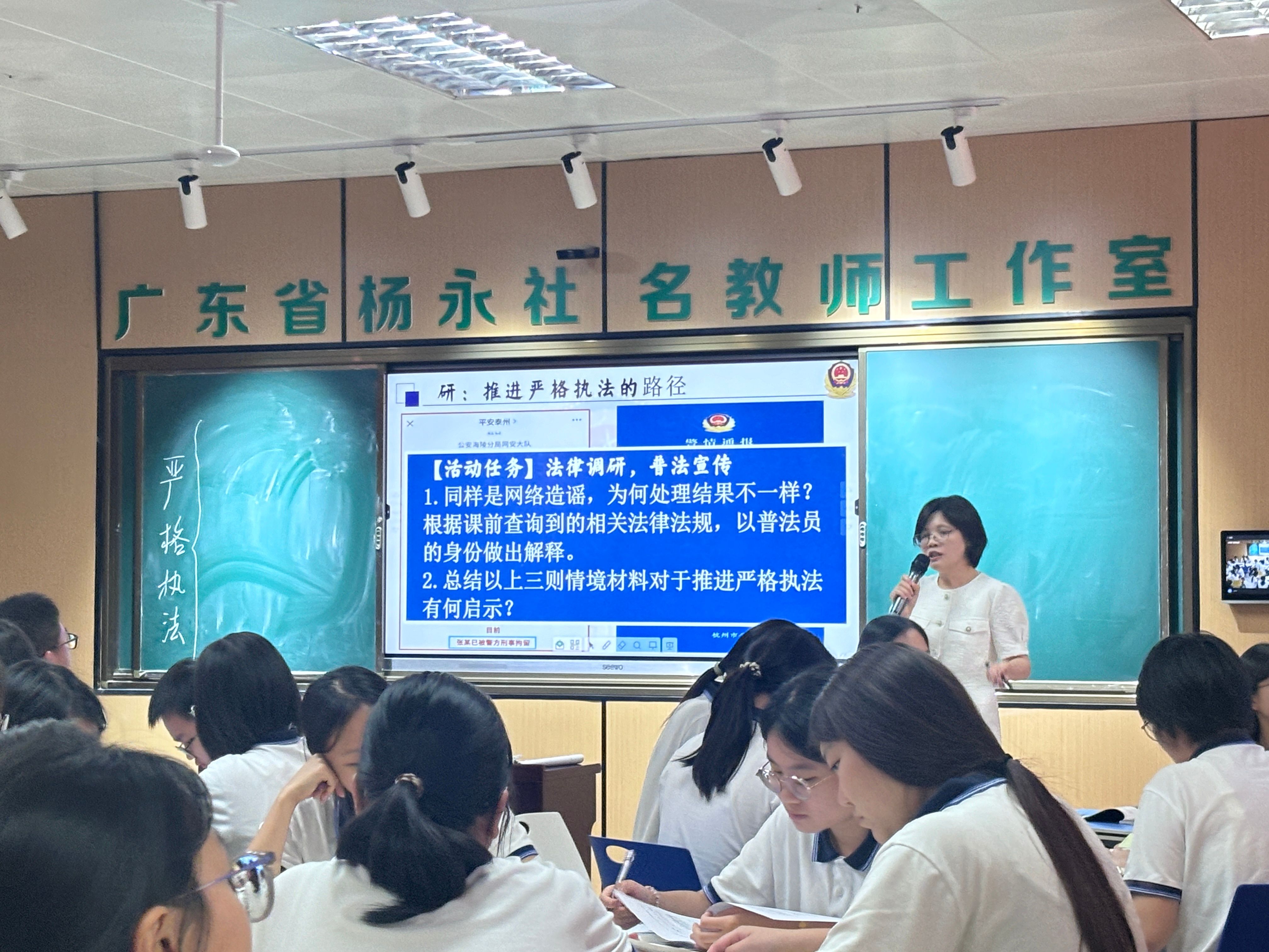 2025年5月21日上午,杜蕊老师和唐亚萍老师围绕《严格执法》开展同课异构教学。杜蕊老师创新采用“模拟问政”形式,结合青岛民企充电桩审批受阻案例,组织员工分组进行角色扮演,在互动体验中探讨严格执法的核心要义,课堂兼具趣味性与思辨性。唐亚萍老师则以“寻-研-践”为逻辑主线,从“严打造谣的意义”到“推进严格执法的路径”,最终落脚于“AI赋能执法,构建清朗网络空间”,展现了科技与法治的深度融合。