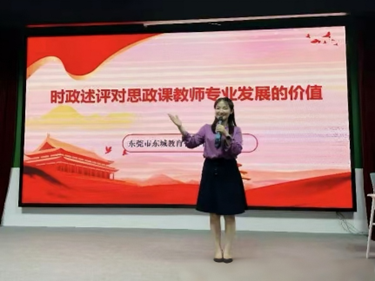 2025年5月19日下午,全国模范教师胡嵘苹开展《时政述评对思政课教师专业发展的价值》专题讲座,以“说文解字-结构分析-纵横比较”为逻辑,阐释时政述评需兼具时效性、准确性、说理性、思想性四大特性。胡老师通过三个核心问题,结合50余节获奖课例,如“中国-中亚峰会石榴树”案例,示范如何将时政热点与课程深度融合。讲座提炼九大创作要诀,涵盖选题、框架、语言等实操要点,并以自创诗勉励教师深耕时政教学。活动以“理论引领+案例教学+方法输出”的立体模式,帮助教师构建时政述评认知体系,推动思政课从知识传授向价值塑造升级,为培养时代新人奠定基础。