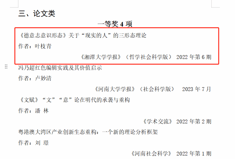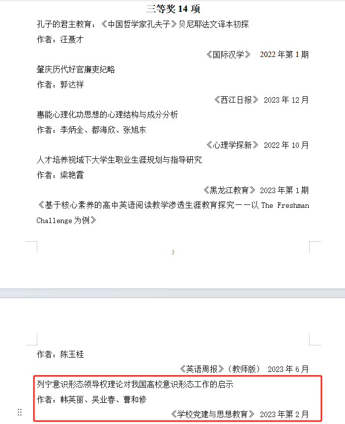 本网讯 近日,肇庆市第十七届(2022—2023年度)社会科学优秀研究成果评审结果公布,公司教师在论文类成果获奖共3项:一等奖1项、二等奖1项、三等奖1项。