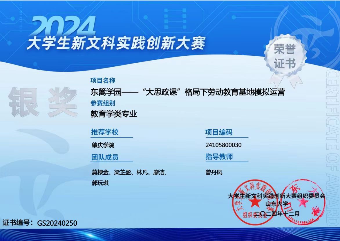 项目团队立足"大思政课"建设背景,深度调研广东省肇庆市怀集县劳动教育基地现状,创造性融合思想政治教育与劳动教育理念,运用新文科交叉学科思维,构建起"政产学研用"五位一体的劳动教育新模式。该项目不仅为乡村振兴背景下劳动教育基地建设提供了可复制的运营范式,更开创了思政教育实践育人的新路径。