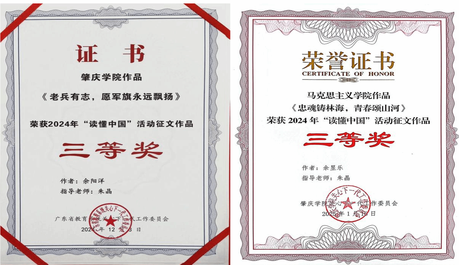 在征文作品中,余阳洋同学的作品《老兵有志,愿军旗永远飘扬》(指导老师:朱晶 )荣获省级三等奖;余昱乐同学的作品《忠魂铸林海,青春颂山河》(指导老师:朱晶)荣获校级三等奖。微视频作品中,符彦、李炜靖同学的作品《弘扬铁军精神,传承红色基因》(指导老师:朱晶、林润燕)荣获省级三等奖;郑彤、李曼妮、林嘉庆同学的作品《赓续岳山造林精神,砥砺乡村教育一线》(指导老师:朱晶、曹和修)荣获校级二等奖。