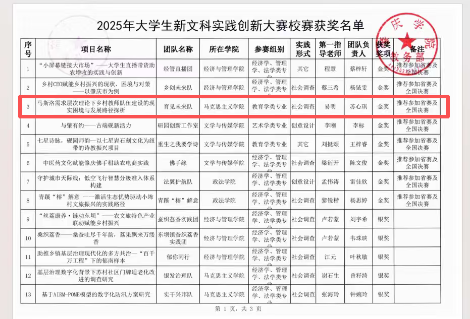 此前,24级思政2班苏心琪同学作为项目负责人,连同项目成员梁柏源、曾思齐、周丽梅、谭智浩等思政专业的同学,在公司专业老师易明的指导下,组成项目团队,积极参与校内新文科实践创新大赛赛事。团队成员在指导老师的精心教导下,凭借对专业知识的深入理解与创新思考,历经层层比拼,在80个项目中脱颖而出,以《马斯洛需求层次理论下乡村教师队伍建设的现实困境与发展路径探析——以广东省罗定市为例》为研究项目最终斩获校内新文科大赛金奖,并代表公司出征省赛。