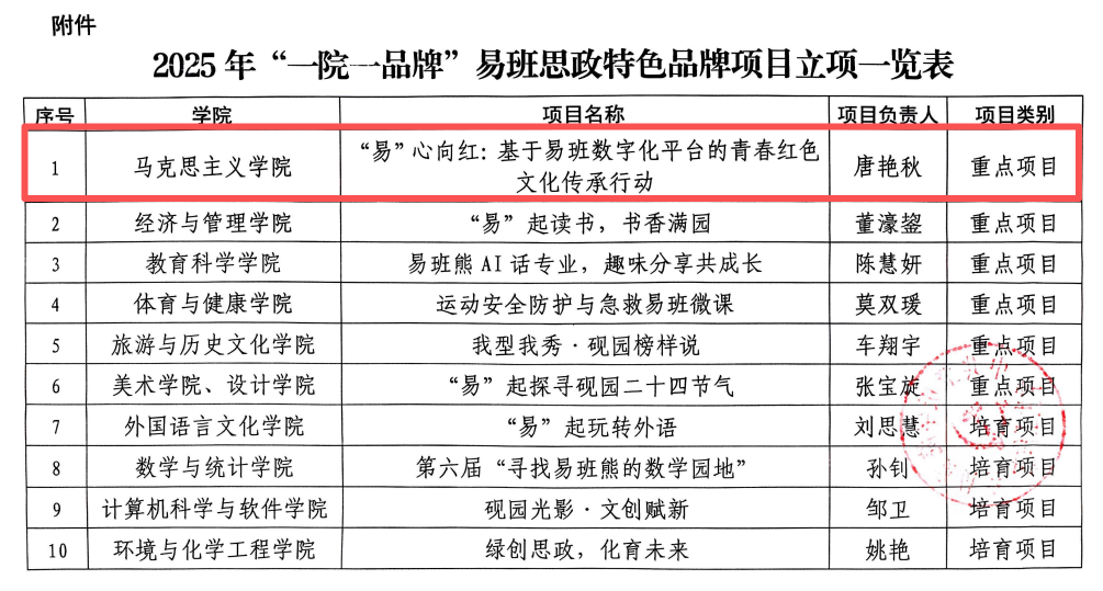 在2025年公司“一院一品牌”易班思政特色品牌项目评选中,唐艳秋老师负责的《“易”心向红:基于易班数学化平台的青春红色文化传承行动》成功获批重点项目立项。该项目以易班平台为载体,将思政教育与网络育人场景深度融合,是公司探索思政育人新形式的具体实践,将为公司的思政品牌建设提供可借鉴的特色路径。