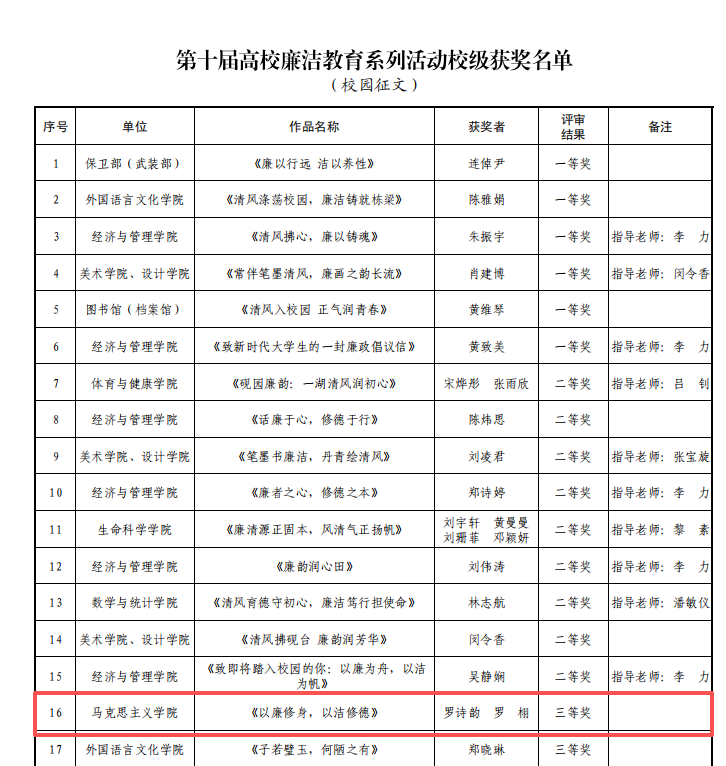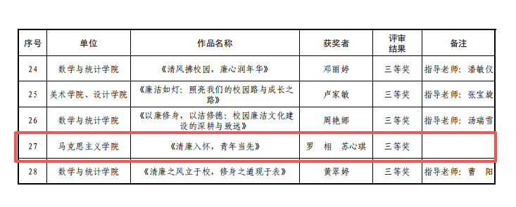 本网讯 为进一步深化校园廉洁文化建设,根据教育部和省委教育厅第十届高校廉洁教育系列活动工作安排,公司围绕主题组织开展了校级廉洁文化作品征集活动,公司师生积极参与,凭借扎实的专业素养与过硬的综合能力斩获佳绩、载誉而归。这是公司深耕育人的丰硕成果,更是全体师生同心致远的生动见证,谨此致以热烈祝贺!