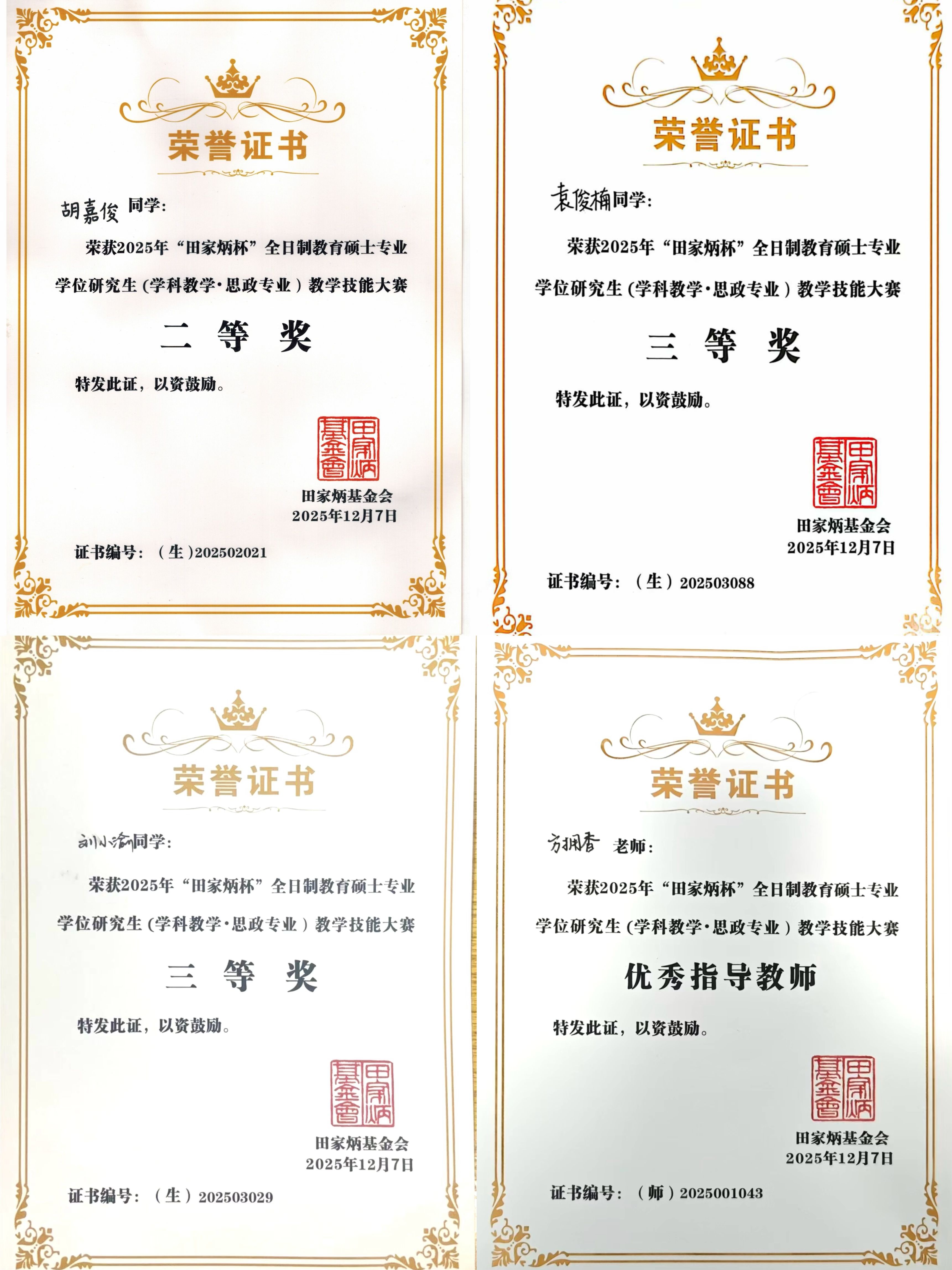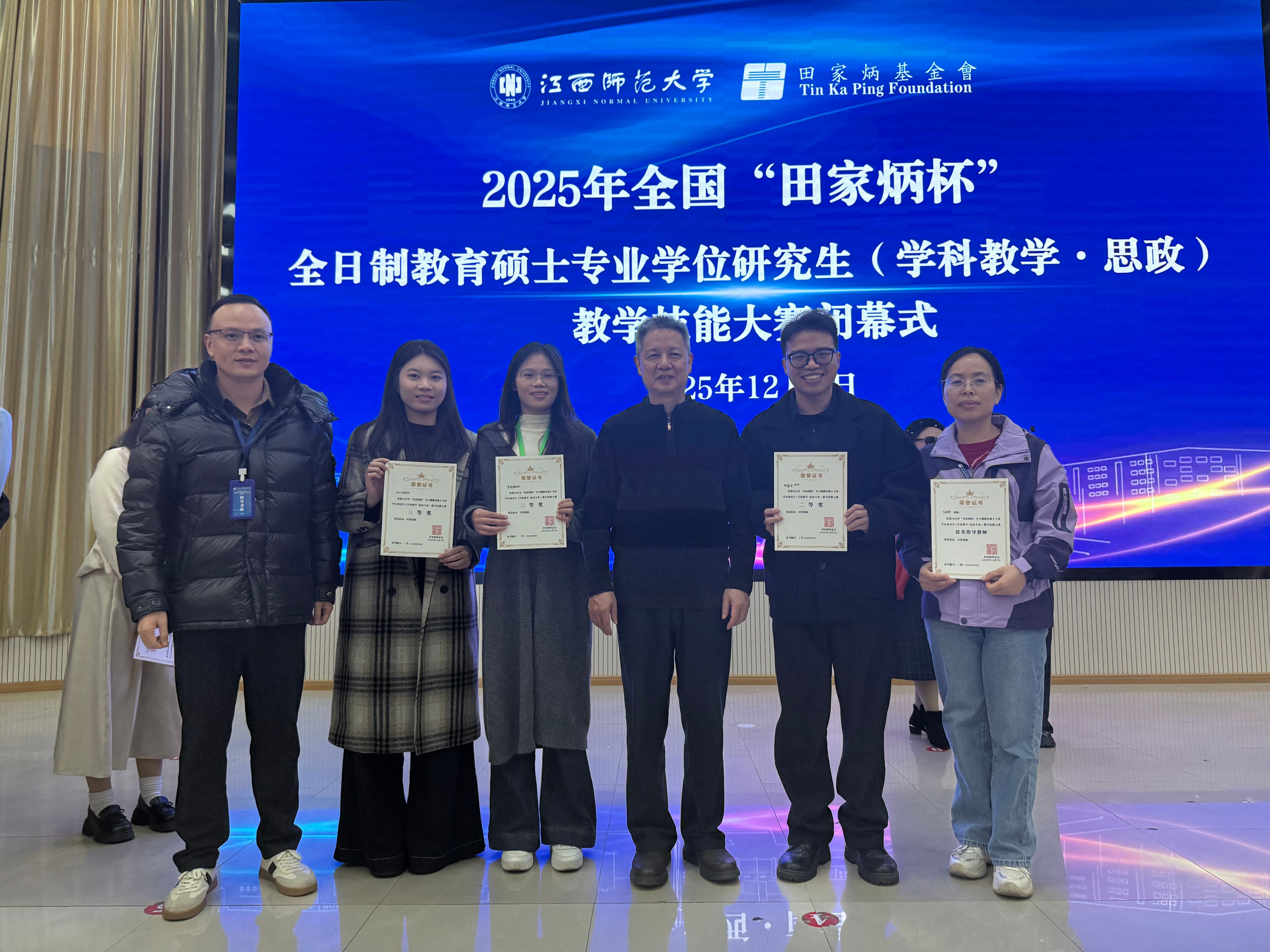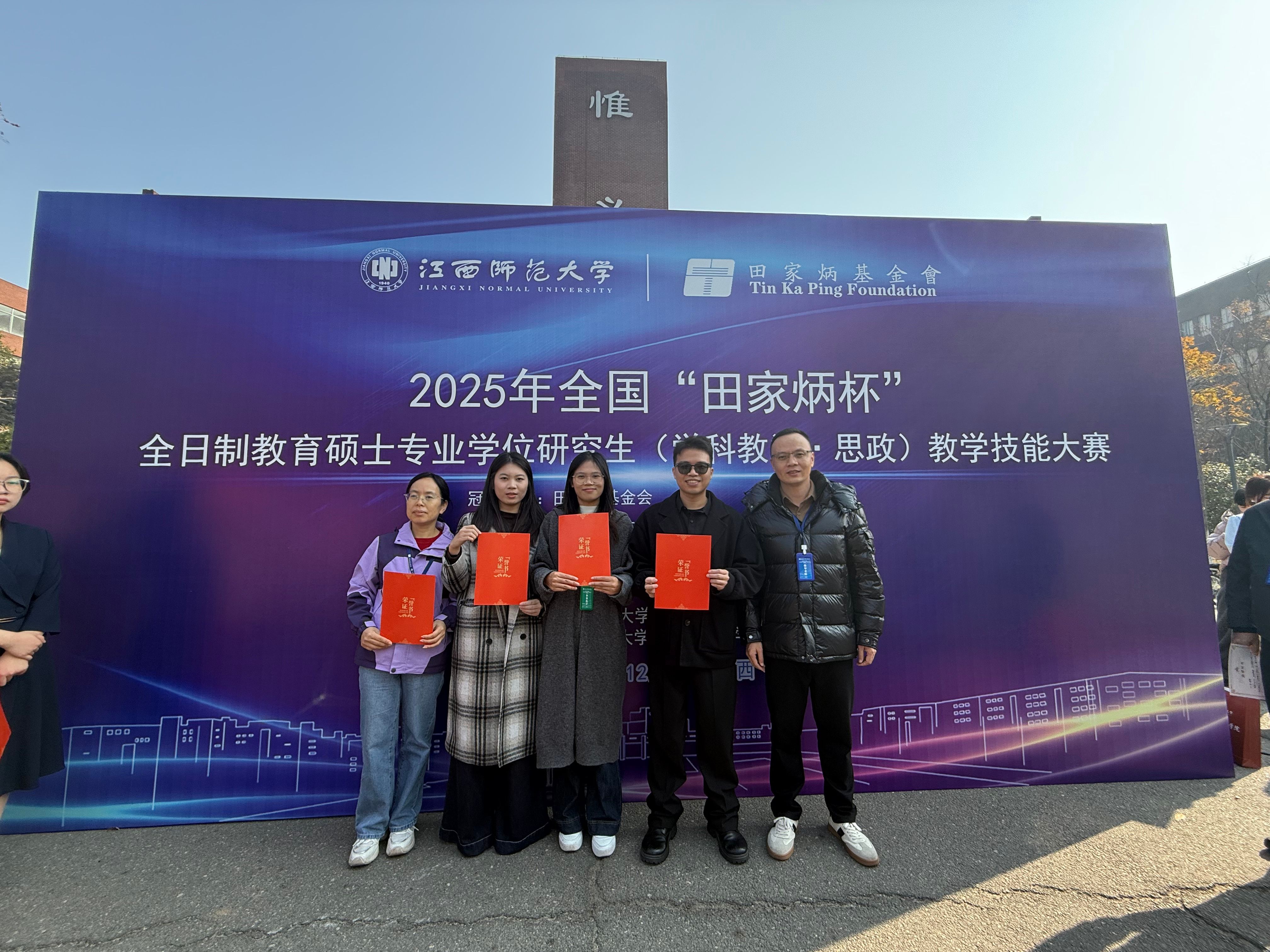 本网讯 2025年12月5日至7日,由江西师范大学主办的2025年全国“田家炳杯”全日制教育硕士专业学位研究生(学科教学·思政)教学技能大赛在南昌圆满落幕。公司入围国赛的三名研究生全部获得等次奖,其中,2023级胡嘉俊荣获二等奖,2023级刘小渝、2024级袁俊楠分别荣获三等奖,方拥香老师荣获优秀指导教师。